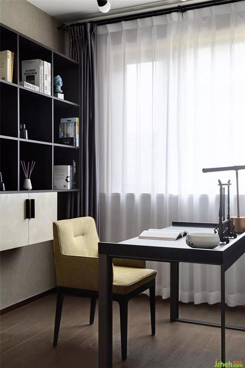 光線明亮的書(shū)房,配上木質(zhì)的家具、地板,以及橄欖綠的椅子,營(yíng)造出相對(duì)溫潤(rùn)的氛圍;至于墻上的書(shū)柜則是定制款,是依據(jù)整屋色系而加以設(shè)計(jì)。