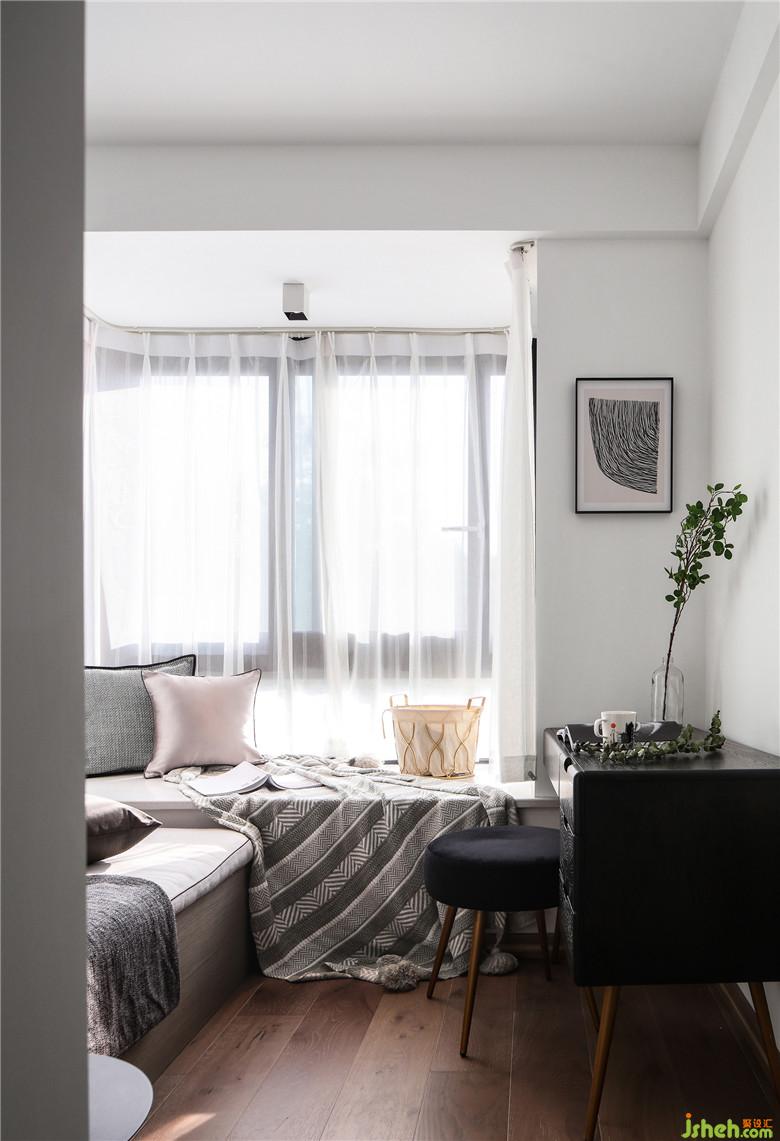 墻角裝修公司選購了一套梳妝臺,表面是翻蓋式的鏡子,內(nèi)嵌儲物格,合上時又可以作為書桌使用,裝修公司搭配天鵝絨的圓凳,柔軟舒適。窗前擁有一個大的飄窗,無論坐在桌邊看書還是靠在飄窗上都可隨自己的心意,悠閑而自在。
