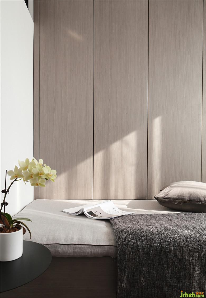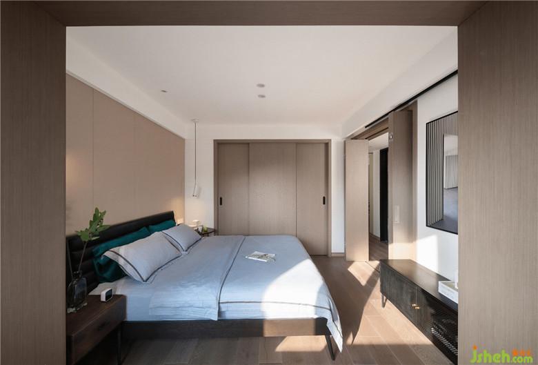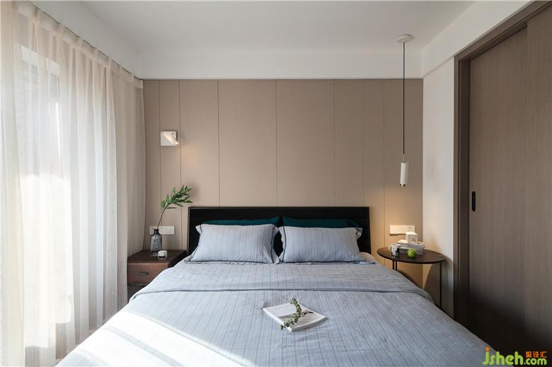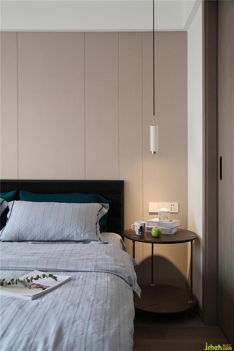 臥室的床頭背景采用了淺咖灰色的硬包,簡潔柔和,與整屋色調(diào)相一致。床頭靠背配有黑色軟包,倚靠更加舒適,搭上淺藍色的純棉床品,時尚且優(yōu)雅,給屋主帶來舒暢的睡眠體驗。