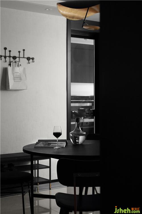 餐廳旁的墻面上裝了一款黑色的圓形掛鉤,可以方便進(jìn)出門的簡單收納,又可作為一件精致的墻飾。地上配了一款簡單的鞋架,可作為部分鞋子的收納,由于此房為一梯一戶,電梯口配有鞋柜,所以室內(nèi)配上這款鞋架完全夠用。
