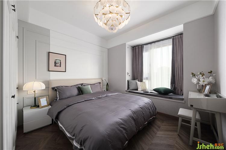 主臥吊燈選購了一款金色五金+白色玻璃的組合,整體干凈清爽,充滿高級感。床頭背景的護(hù)墻板做了分色,白色搭配淺灰的跳色,給靜謐的空間帶來一絲時(shí)尚氣息。墻上的掛畫并沒有掛在居中的位置,剛好靠近分色處,這樣更能體現(xiàn)出整面墻的層次感。