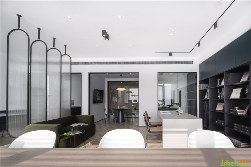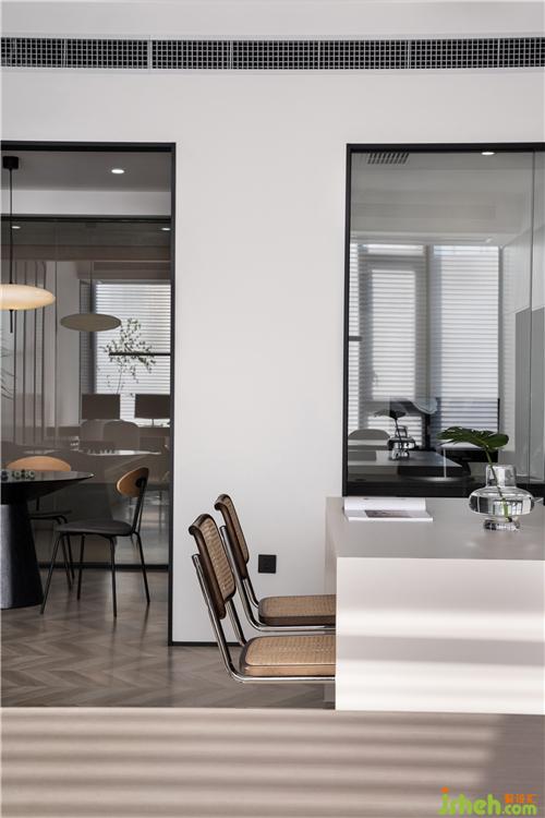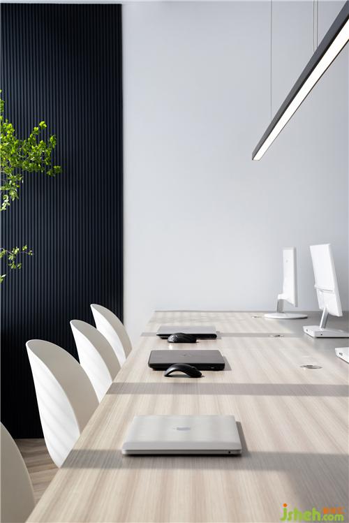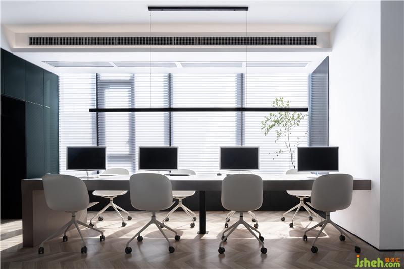 從工作區(qū)可以看到室內(nèi)的全景,公共區(qū)采用了無主燈設(shè)計,視覺上顯得層高更高,光線更加均勻,使得空間簡潔明凈。對面的洽談區(qū)外是透明玻璃,室外走道的光線也可以通透進來,增加了視覺的延伸感。