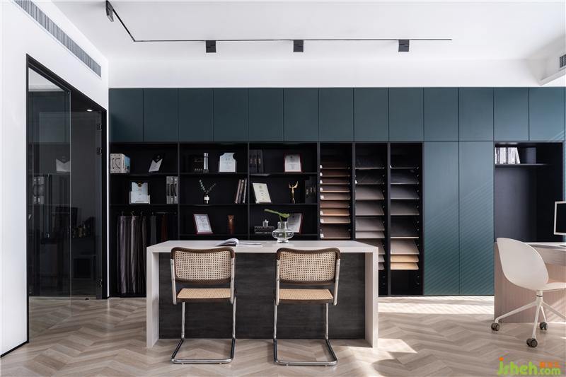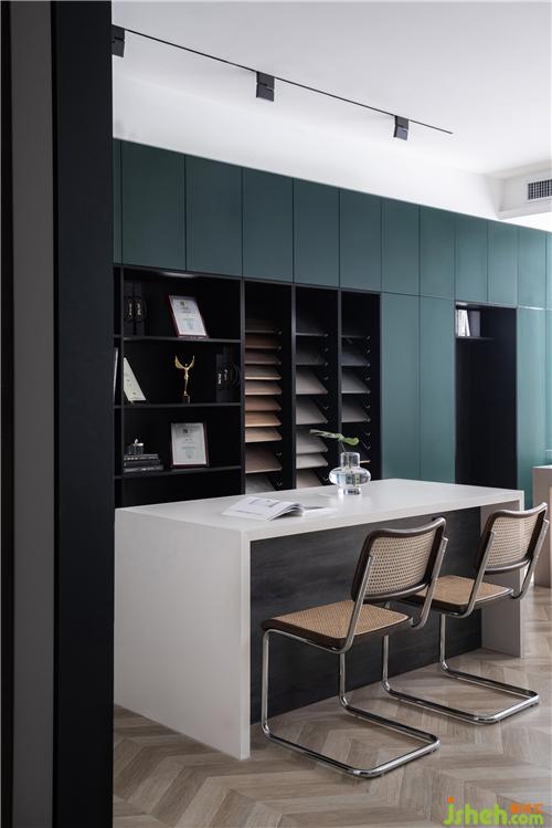 軟裝區(qū)的儲物柜將封閉式與開放式相結(jié)合,既可作為展示,又可以收納;墨綠色與黑色的組合,反而可以放大墨綠色本身自帶的那一股酷酷勁兒,既復古又高級,給人耳目一新的感覺。頂面安裝了磁吸軌道燈,時尚簡約,南京辦公室設(shè)計可隨意調(diào)節(jié)燈具位置,提升了空間的格調(diào)。