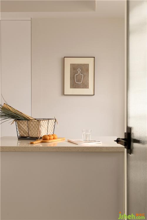 緊鄰餐桌的位置定制了奶咖色的島臺,延伸的臺面可以充當(dāng)餐桌,備餐端菜,一氣呵成。用餐之余,還能夠作為吧臺、工作臺使用,營造出溫馨活潑的家居氛圍。墻面搭配一幅藝術(shù)掛畫,帶來生活上的一份小美好。