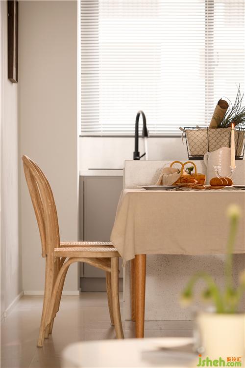 通過玄關(guān)就來到了餐廳,餐廳采用餐桌+兩把靠椅+兩把條凳的組合方式,使空間看起來不死板,沒有靠背的條凳也會更節(jié)省空間。餐桌椅選擇了原木材質(zhì),搭配上藤編的工藝,南京室內(nèi)設(shè)計(jì)師自帶一種質(zhì)樸隨和的氣質(zhì),在光線的暈染下,整體散發(fā)出復(fù)古韻味。餐桌鋪上一塊奶咖色的餐布,營造出溫暖、有活力的氛圍,更能增加食欲。餐椅后面的墻體拆除后,定制了一排暖白色的儲物柜,轉(zhuǎn)角處同樣采用了圓弧處理,增加收納的同時又使空間顯得更輕盈明潤。