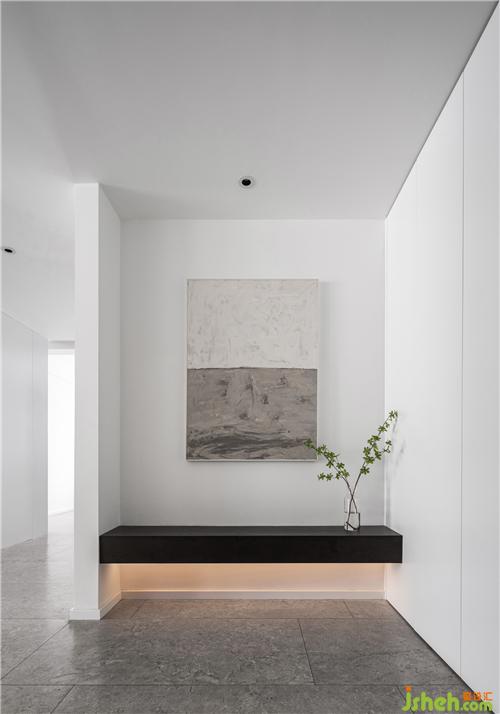 玄關(guān)一側(cè)定制了白色的柜子,配合上留白的墻面,整體清爽明潤;頂天立地的玄關(guān)柜設(shè)計,為空間增加更加收納。懸空的黑色換鞋凳,不僅可以坐著換鞋,還可作為放置裝飾品的端景使用;在暖光的渲染下,更顯輕盈質(zhì)感。