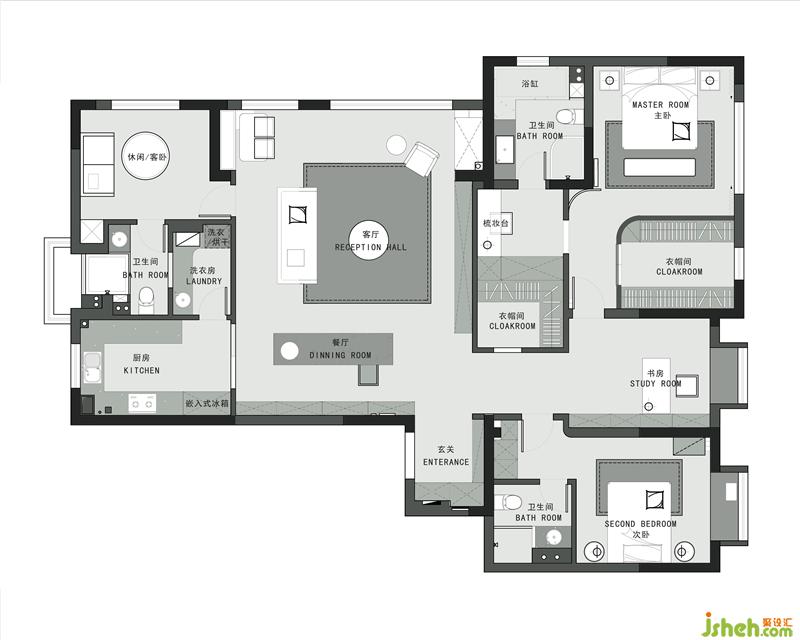 5.休閑室進門位置和洗衣房一側(cè)的墻體整體向客廳外拓,使其在一條動線上