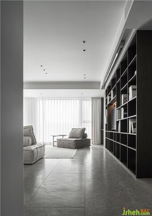 6.客廳通往書房的墻體拆除,設(shè)計了一處開放式的書房