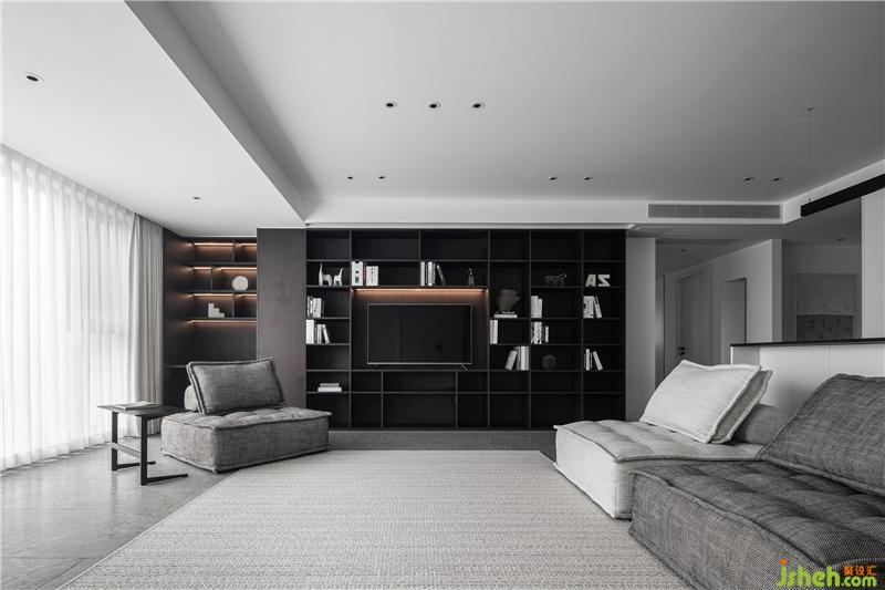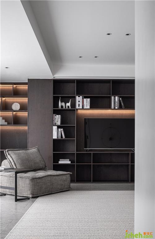 整面的開放式書柜,滿足了屋主愛看書的習(xí)慣。將電視內(nèi)嵌于其中,滿足多種功能需求。