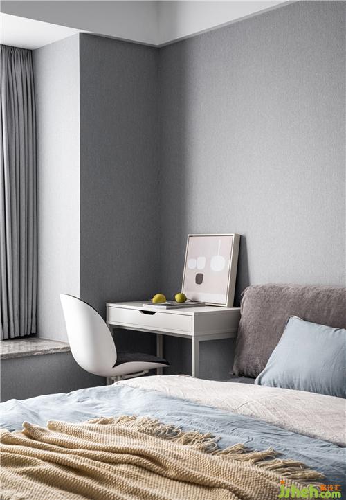 次臥在灰白的色調(diào)下點(diǎn)綴淡藍(lán)色,以簡(jiǎn)約的設(shè)計(jì)手法構(gòu)筑純粹的生活情境,靜謐與質(zhì)感的格調(diào)氤氳而生。