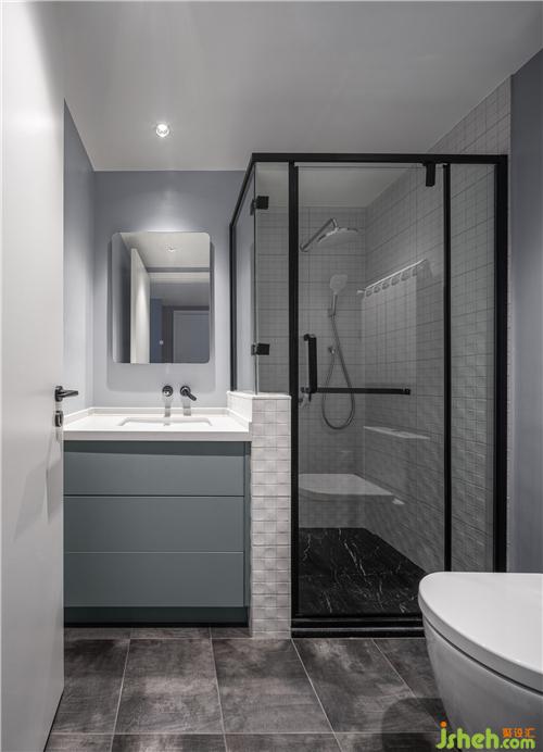 鋪滿白色小方磚的半矮墻和透明玻璃將干濕區(qū)域做了分隔,淋浴、馬桶和洗漱臺(tái)功能劃分明確,整體給人一種自然清爽的感覺,更顯簡(jiǎn)約、潔凈。