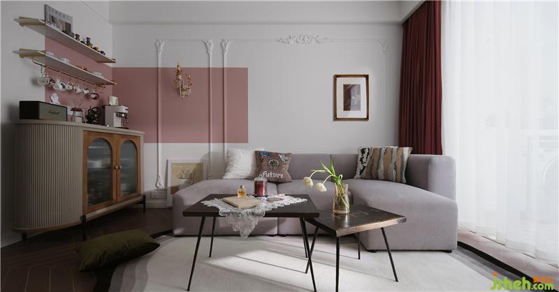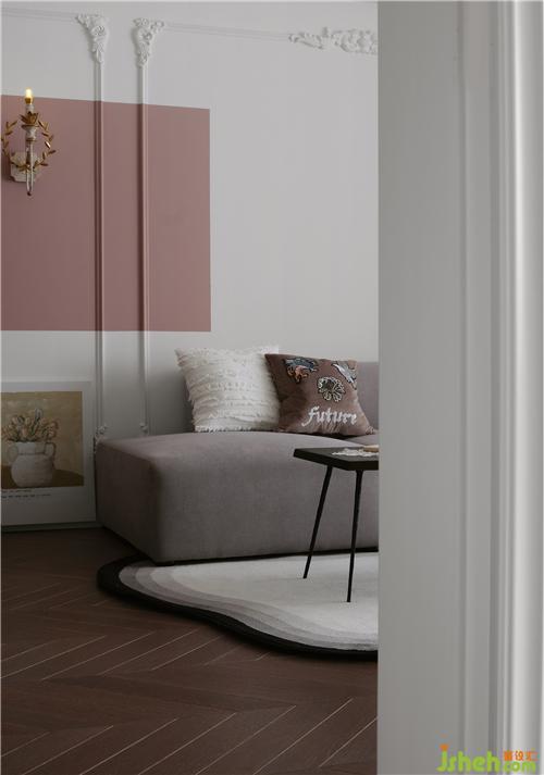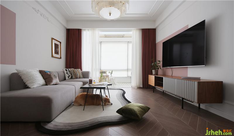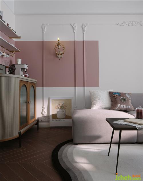 電視墻同樣運(yùn)用了白色與粉色的撞色設(shè)計,與沙發(fā)墻彼此相呼應(yīng),清爽利落,使得空間更加洋氣和時髦。電視柜集開放、封閉、收納、展示于一身,營造輕盈的視覺美感,胡桃木的材質(zhì)也為空間帶來一份溫潤質(zhì)感。