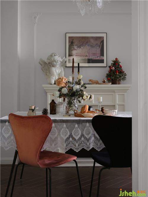 浪漫的餐廳空間,鋪上一塊滿繡圖案花型的蕾絲桌布,在水晶燈的配合下,與精美的餐椅交織,南京室內(nèi)設(shè)計師協(xié)調(diào)出柔和的用餐氛圍。壁爐一角為靜謐氛圍增添了浪漫氣息,賦予空間更多內(nèi)涵,帶來審美與精神上的雙重享受。