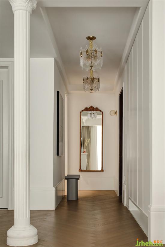 通往客廳的過道,頂面采用兩個(gè)中古風(fēng)的玻璃吊燈提供照明,帶來一點(diǎn)懷舊,一點(diǎn)浪漫。墻面一側(cè)定制了頂天立地的儲(chǔ)物柜,白色中透射出清新感,底部做了鏤空設(shè)計(jì),方便存放當(dāng)季的鞋子。與客廳相接之處,南京裝修設(shè)計(jì)定制了頂天立地的法式造型柱,圓潤的外形、簡潔的線條和雕花的點(diǎn)綴,不僅沉淀了空間的摩登氣質(zhì),也提升了整屋的藝術(shù)氣息。
