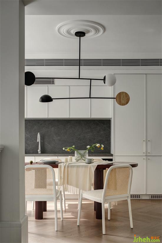 餐廳頂部安裝了一款簡約的石膏燈盤,把一個(gè)光潔的頂面變成了一個(gè)充滿幻想的焦點(diǎn),南京裝修設(shè)計(jì)增加了空間的藝術(shù)氣質(zhì)。燈盤下配上長桿極簡吊燈,外觀時(shí)尚高級,高低錯(cuò)落間,增強(qiáng)了空間的層次感。