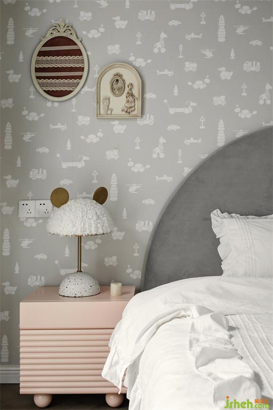 煙粉色的床頭柜,高度48公分,圓球柜腿+波浪紋的設(shè)計(jì),南京裝修設(shè)計(jì)增添了幾分樂趣;搭配上毛絨米奇臺(tái)燈,墻上點(diǎn)綴兩幅墻飾,營造出浪漫、溫馨的居住氛圍。