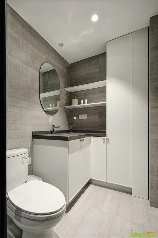 衛(wèi)生間實(shí)用而清爽,臺(tái)盆右側(cè)做了儲(chǔ)物柜和擱板設(shè)計(jì),保證收納的同時(shí)又使得常用物品拿取便捷,保持臺(tái)面的整潔。舍棄了鏡柜設(shè)計(jì),南京裝修設(shè)計(jì)以橢圓形鏡子取代,利用橢圓造型打破空間的沉悶感。室內(nèi)設(shè)計(jì)師
