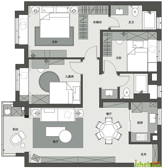 該項目位于南京南站的萬科都薈天地,建筑面積120㎡,精裝交付,戶型為三室兩廳一廚兩衛(wèi)設計。南京家居設計戶型方正,雙臥朝南,客餐廳連接向南陽臺,采光充足,主臥套房設計,私密性好。除了主臥,其余兩個臥室空間較??;主臥步入式衣帽間空間使用率不佳。
