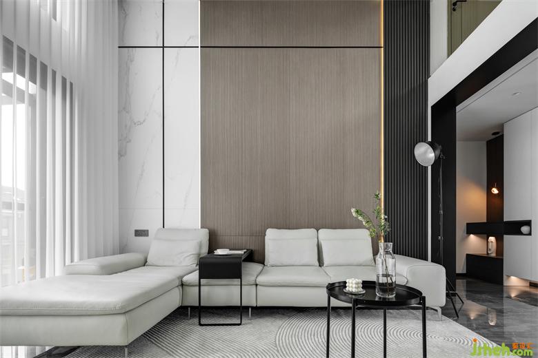 沙發(fā)背景墻由木質(zhì)格柵、木飾面和石材所組成,黑色線條做點綴,簡約中更顯精致和設(shè)計感;深咖、淺咖、白色,色彩上由深到淺,材質(zhì)與顏色的變化配合上挑空的高度,南京裝修設(shè)計使得家居空間在和諧統(tǒng)一中富有層次感與舒適感。
