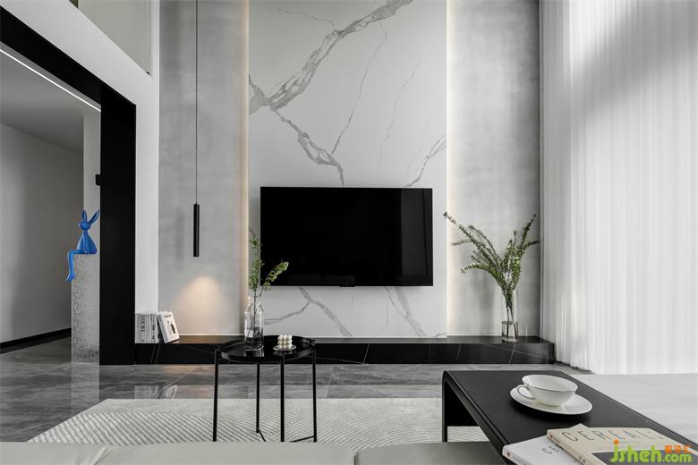 電視背景墻通過白色的巖板貫通到頂,兩側(cè)采用淺灰色的微水泥做襯托,清新淡雅,使得客廳在縱向上拉長,流動的自然紋理增加了空間的視覺延伸感,南京裝修設(shè)計提升了空間的顏值和氣質(zhì)。底部與石材地臺相銜接,黑色與自然紋理的結(jié)合,渲染出靜謐深邃的氛圍,上面可以擺放裝飾品、書籍等,提升空間的藝術(shù)品味。
