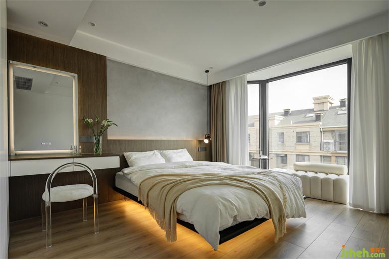 臥室與窗戶之間的地臺(tái)拆除后,呈現(xiàn)了一個(gè)大的落地窗,給人一種大氣高級(jí)的感官體驗(yàn),外面的景觀盡收眼底,絲絨軟凳+玻璃邊幾的組合,便可打造一處令人放松的休閑區(qū)。光線無(wú)遮擋進(jìn)入室內(nèi),結(jié)合無(wú)主燈的燈光設(shè)計(jì),光線的分布與照射更加均勻,南京裝修設(shè)計(jì)從視覺上拓寬了空間感。無(wú)床頭的雙人床,床底添加了隱藏式燈帶,柔和的感應(yīng)燈光使起夜更便捷,帶來一種舒緩的輕盈感。