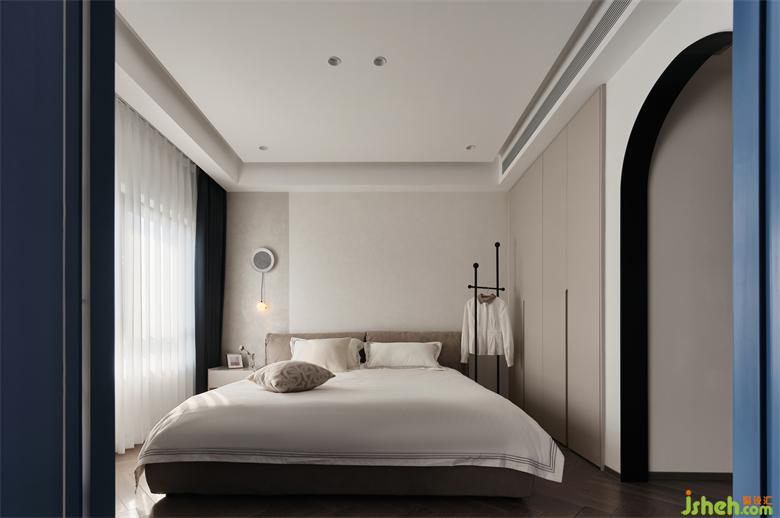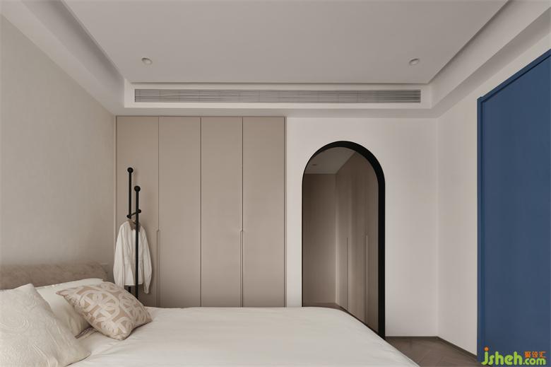 穿過拱形門洞進入步入式衣帽間,劃分出獨立的兩個區(qū)域,南京藍天水岸花園家裝設計柔化空間的視覺效果,提升了空間的顏值和藝術(shù)氣質(zhì)。