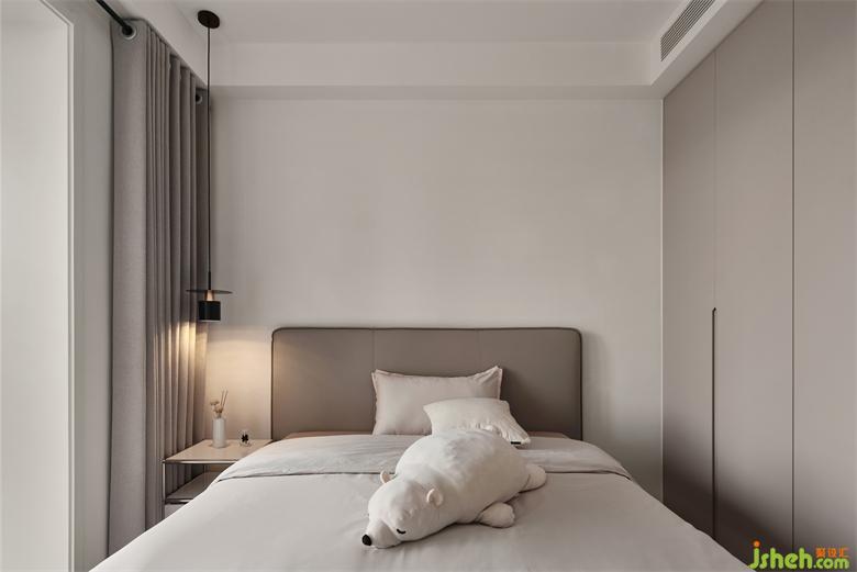 次臥購置咖色的皮質(zhì)靠背床,定制與主臥相同色系的衣柜,保證空間的統(tǒng)一性,簡約中透露出溫馨。