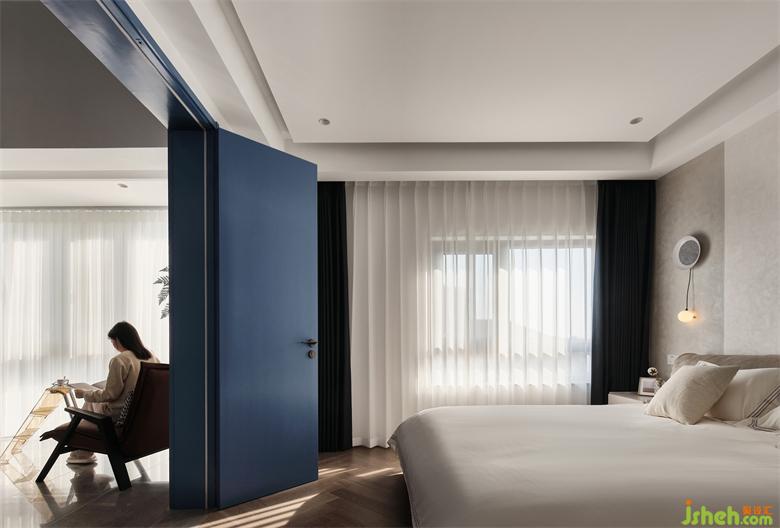 床頭搭配一款黑色小吊燈,纖細優(yōu)雅,南京藍天水岸花園家裝設計增加了空間的層次感,柔和的光線,點亮溫馨一角。