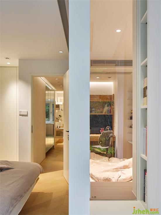 從走廊可進(jìn)入衛(wèi)生間和兒童房,兒童房定制玻璃移門,開門不占空間,保證空間的利用率,營造出一種透光不透色的朦朧美感,南京銀城聚錦園家裝設(shè)計(jì)同時(shí)還能緩解小空間的壓抑感,在視覺上看起來更加敞亮。
