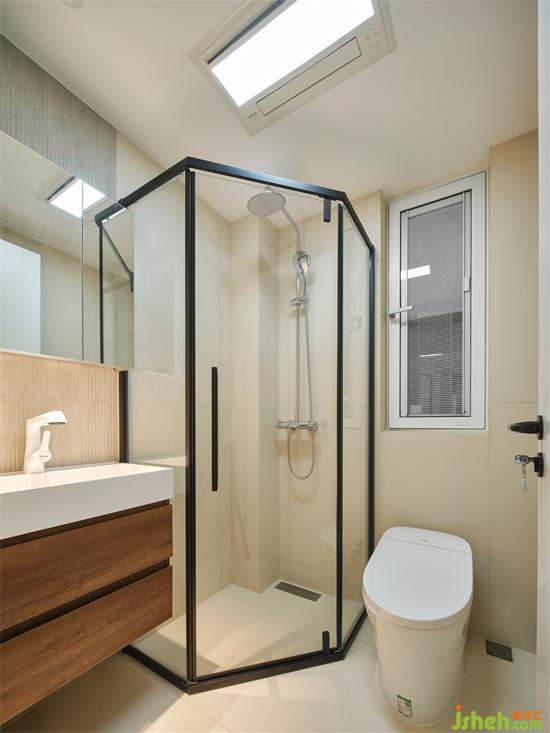 衛(wèi)生間利用玻璃淋浴房形成干濕分離,簡單干凈的米白色瓷磚,在洗手池背景用細(xì)條紋磚作點(diǎn)綴,南京銀城聚錦園家裝設(shè)計(jì)搭配深咖色的浴室柜,營造出清新恬適的衛(wèi)浴空間。