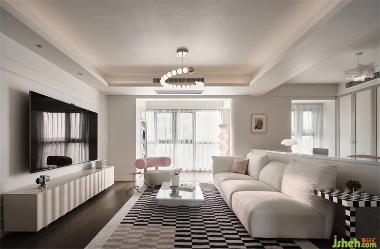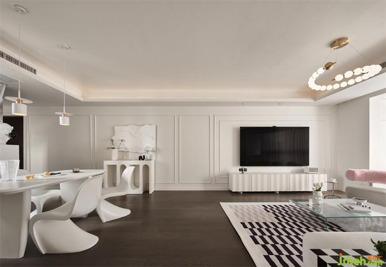 客廳空間以溫潤(rùn)的奶白色為主色調(diào),將現(xiàn)代風(fēng)格與法式元素相融合,南京世茂璀璨江山精裝房改造打造出溫柔治愈又有高級(jí)感的家居空間。