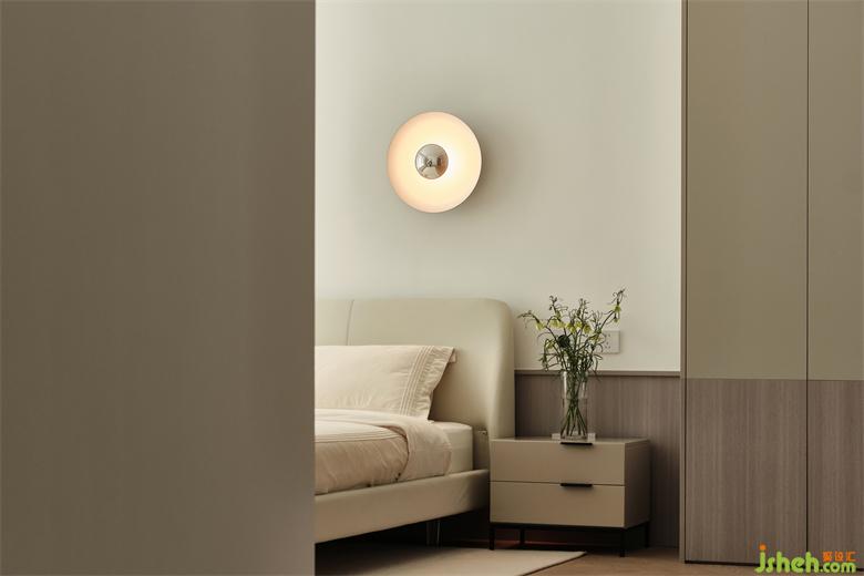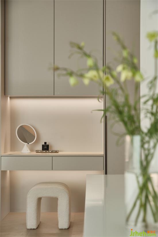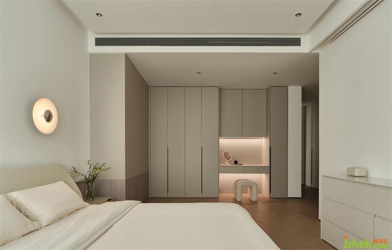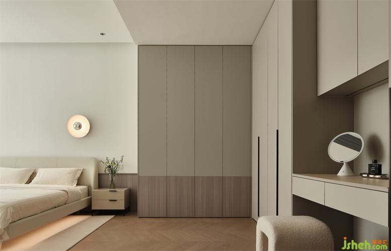 暖白色的床,暖灰色的衣柜、梳妝柜和斗柜,反映著光的溫度、色彩,整體偏溫暖放松,將臥室維持在舒適的光感中。