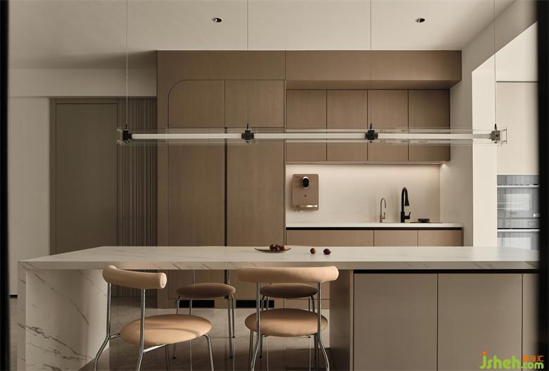 西廚區(qū)中間位置設(shè)計中島,南京藏龍御景家裝設(shè)計滿足用餐的同時又能增加收納;西櫥柜定制咖色和暖灰色,保證空間色調(diào)的統(tǒng)一,滿足功能的同時顯得格外的溫馨和舒適。