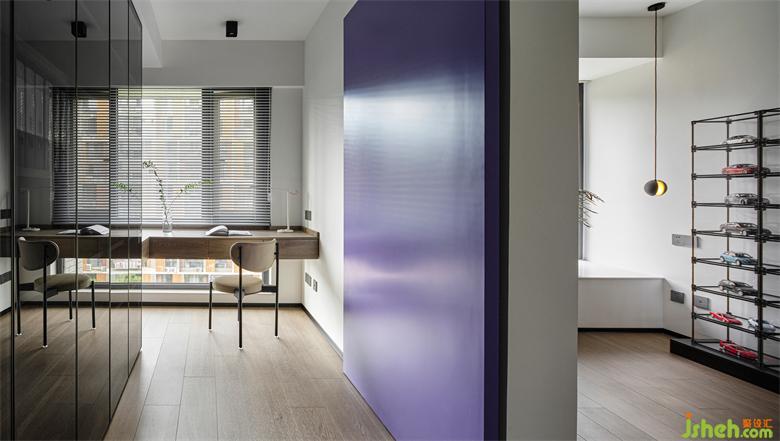 從活動(dòng)室方可進(jìn)入書(shū)房,打造一間安謐之所,兩個(gè)空間以紫色的木質(zhì)推拉門(mén)相隔,與娛樂(lè)室的紫色背景墻相呼應(yīng),在清澈淡雅的空間中增添一份明媚浪漫。沿墻定制一排頂天立地的書(shū)柜,采用黑色的玻璃柜門(mén),增加收納的同時(shí)又帶來(lái)高級(jí)感。