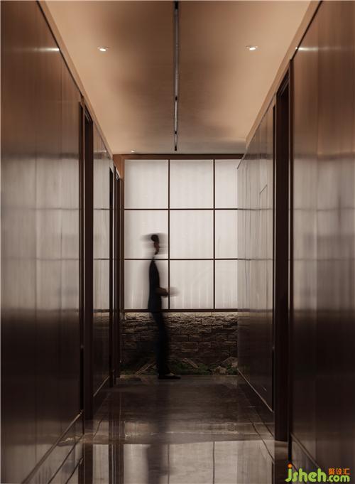 設(shè)計(jì)之初,肯納面臨的首個(gè)問(wèn)題是解決空間布局,這座曾經(jīng)由浴池改建的別墅內(nèi)部空間散亂無(wú)章。于是,肯納設(shè)計(jì)將原有舊樓梯拆除,重新布局將建筑整體貫通,并在緊鄰扶梯處設(shè)置開(kāi)闊筆直的主通道串起整個(gè)內(nèi)部空間,抵達(dá)兩側(cè)功能區(qū)與包房的動(dòng)線均做減法處理,明朗、克制的手法將整個(gè)空間的氣韻向下沉淀。