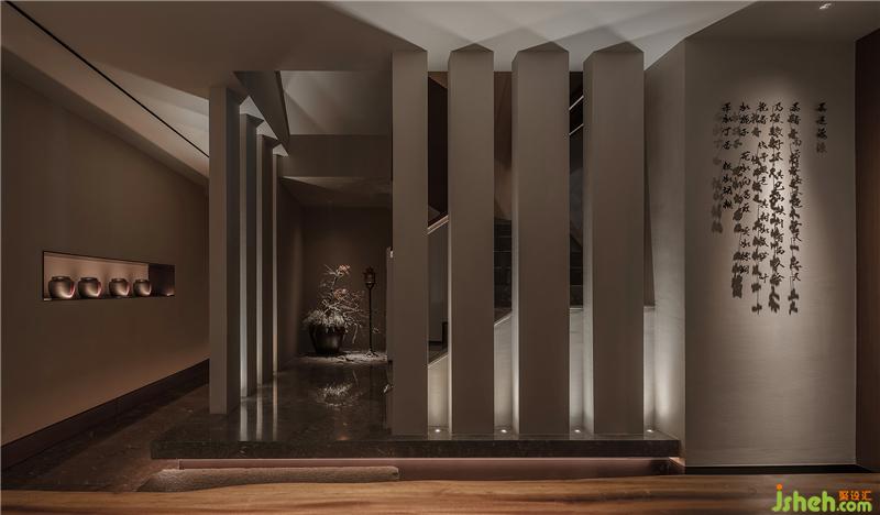 素色結(jié)構(gòu)立柱頂天立地,光線經(jīng)縫隙穿流而過(guò),在天花與墻面形成光影,它們可以是文人書(shū)房格柵的想象,也可以是縱橫山岳起伏的解構(gòu),空間不動(dòng)聲色,但已交出一切。