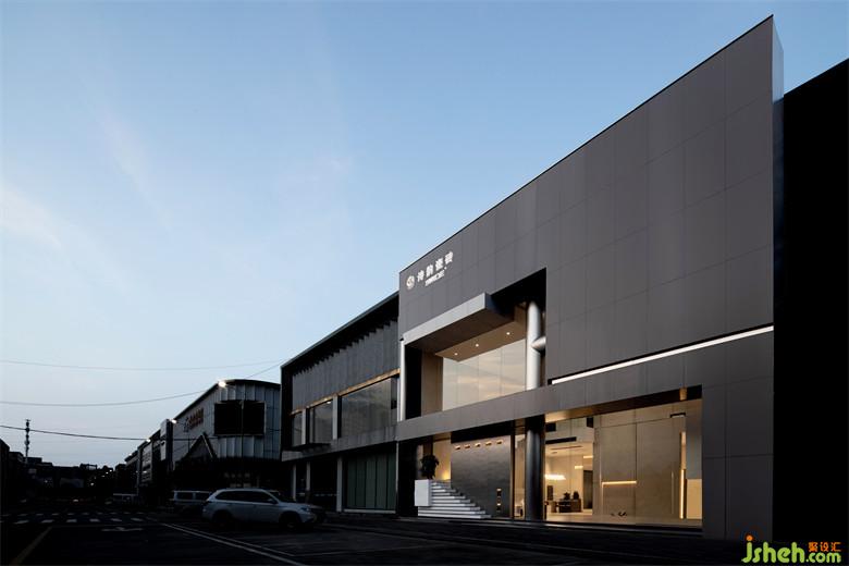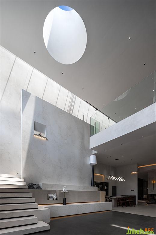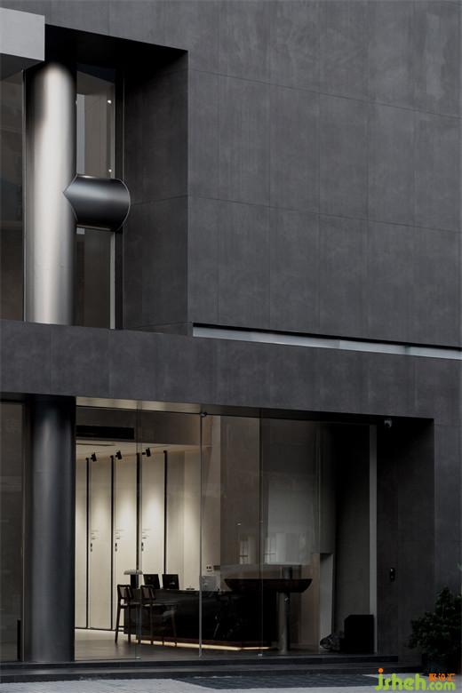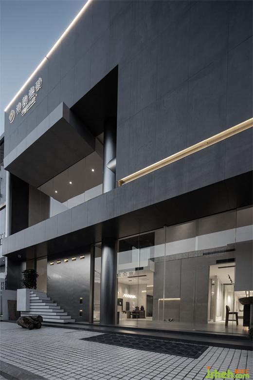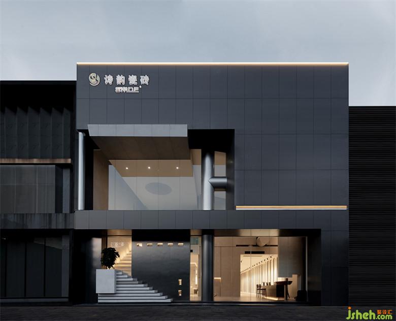 瓷磚場所,以光為引,通過挑空為上下層注入互動,瓷磚展廳設(shè)計打造“藝術(shù)品”般的空間。建筑立面以深灰打底,呈現(xiàn)了優(yōu)雅沉靜的氣質(zhì),幾何體塊碰撞,建筑仿若凝固的時空,泛著銀光的柱體貫穿上下,把光感過渡給三塊框景區(qū),以視覺觀感豐富建筑立面特征。