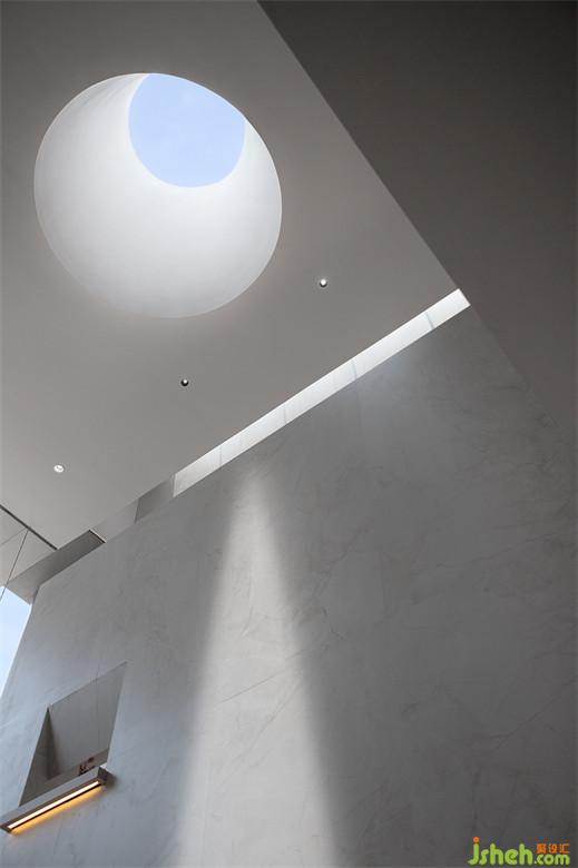 把建筑本身看作一個盒子,入口左側(cè)將光集中于上部,下部陰影自然倒映,瓷磚展廳設(shè)計既平衡著室內(nèi)溫度,又給予光更直接的敘事表現(xiàn)力。打通建筑與天地的聯(lián)結(jié),運(yùn)用天井捕捉藍(lán)天白云,制造光束投射而入的氛圍。