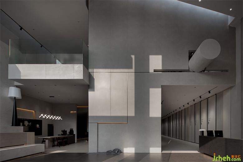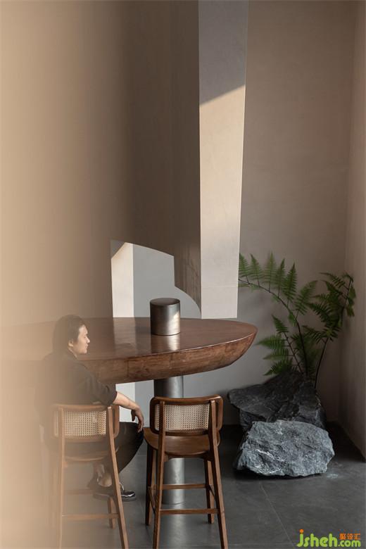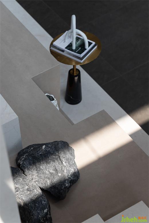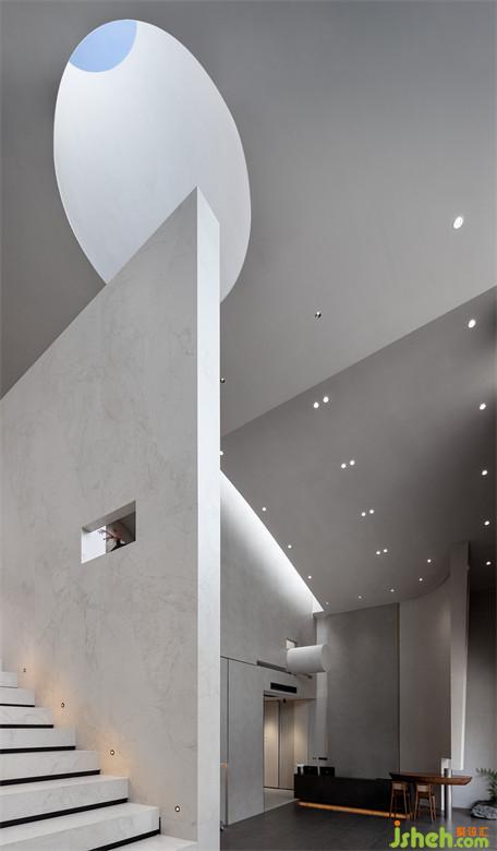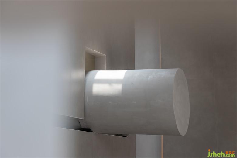 右側(cè)頂面與立面在交叉之際預(yù)留了縫隙,光暈傾灑,讓人注意到了圓柱結(jié)構(gòu),其形體尺度剛好契合天井鏤空的空間,再次強(qiáng)調(diào)了互補(bǔ)意趣。
