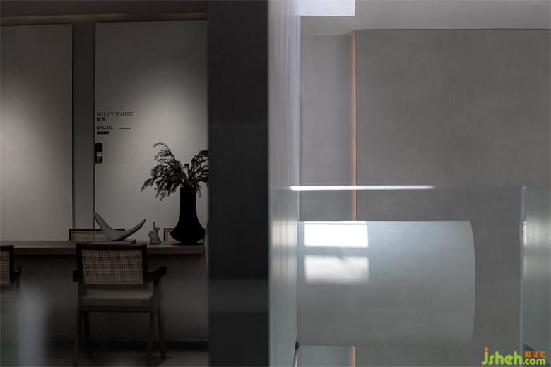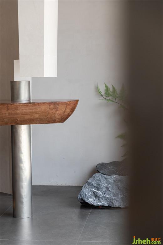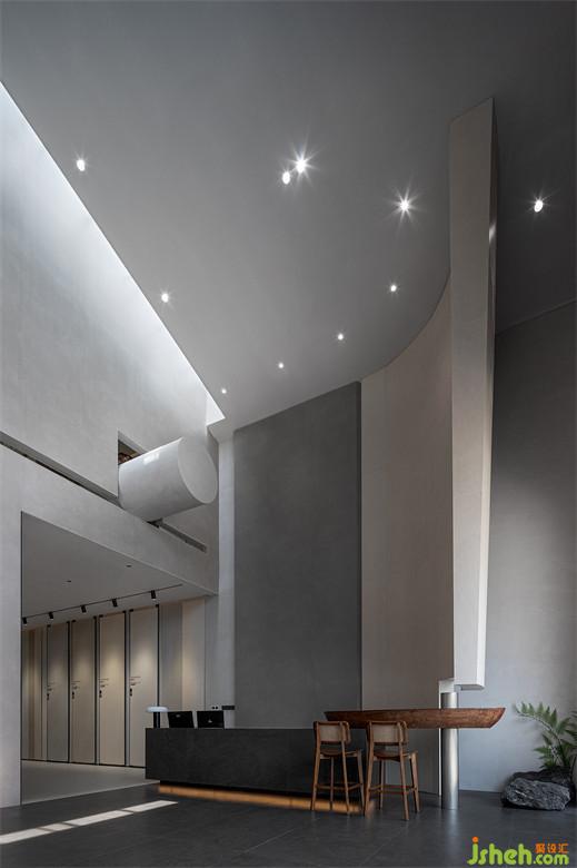瓷磚展廳設(shè)計構(gòu)筑弧面,疊加高于一層、低于二層的灰調(diào)飾面,確立前臺的位置,再以黑色體塊定格前臺的工作區(qū)。擬態(tài)木船的吧臺置于前臺上,展露錯落之美,穿插銀色圓柱,樹立建筑立面的凹凸感和故事性。