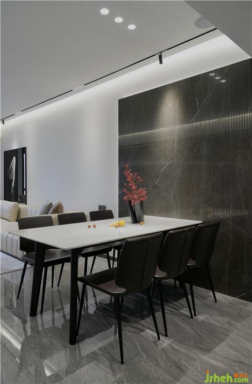 家居裝修設(shè)計開放式餐廳延續(xù)了客廳色彩,空間整體融洽平和,視覺上拉長空間通暢感官,相互之間生活節(jié)奏互相影響而成一體。