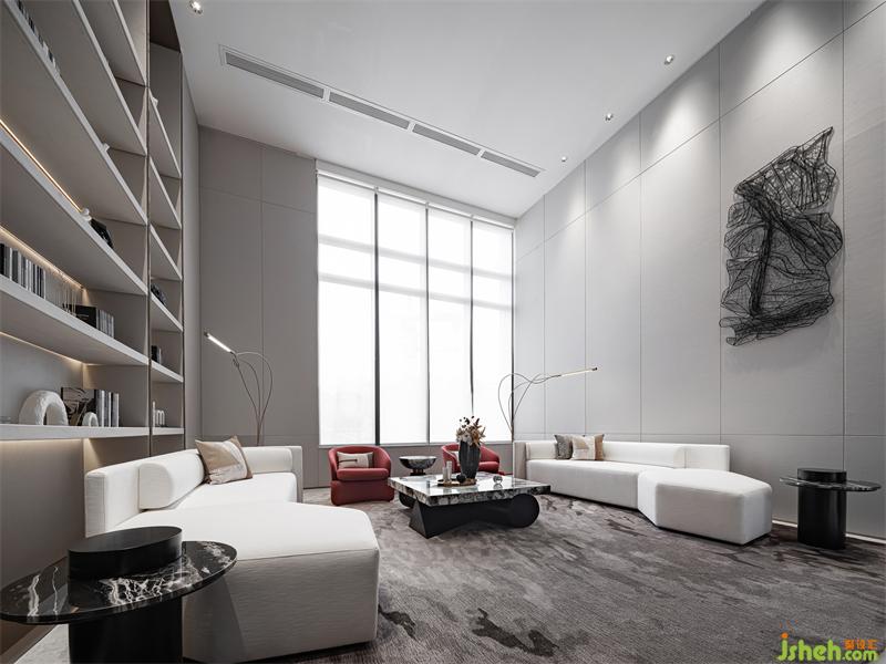 在開(kāi)敞的空間形成段落兜轉(zhuǎn),通過(guò)兩側(cè)不同的光影、明暗的過(guò)濾,傾瀉于此的自然光更顯時(shí)光的分量。光影錯(cuò)落有致,沙發(fā)組凸顯質(zhì)感品質(zhì),點(diǎn)綴紅色洽談椅用來(lái)平衡空間的重量,它或深沉或內(nèi)斂,衍生功能的秩序,空間在低吟淺誦中建立微妙的靜態(tài)平衡。