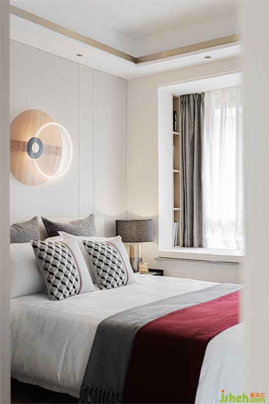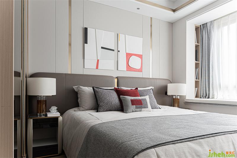 臥室的陳設(shè)被黑白灰加持,紅色的點(diǎn)綴中和了空間配色的單調(diào),形式多樣的裝飾畫與背景裝飾燈讓室內(nèi)氣質(zhì)透著時髦與靈動。