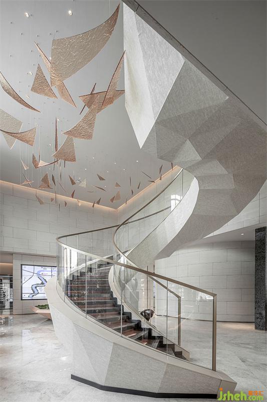對于空間融入氛圍的藝術(shù)裝置一直是設計中加法的呈現(xiàn),“月亮碎片”藝術(shù)造型的融入,似標點、似水滴、似科技光點、似宇宙星垂,帶著專屬的顏色,刻度和肌理,透過開闊明亮的空間展陳,賦予空間以靈動的活力,與切割元素造型堆砌而成的旋轉(zhuǎn)樓梯相互銜接,打破了藝術(shù)矩陣的邊界,讓空間的趣味性和探索性恰到好處。