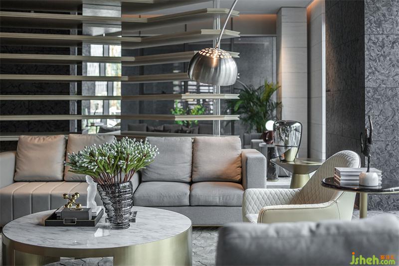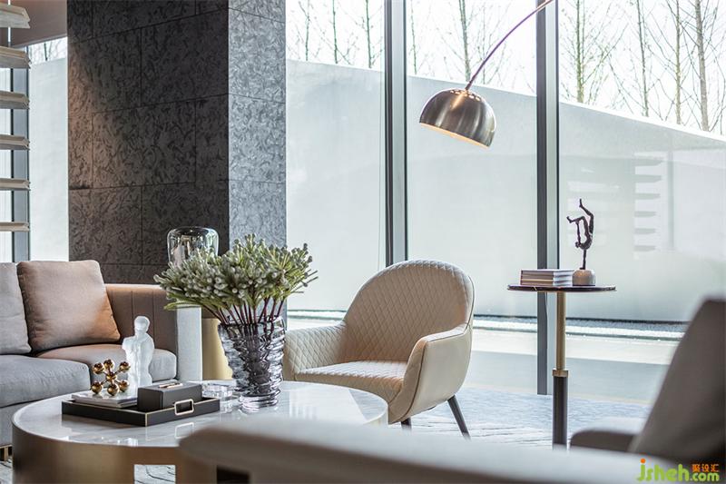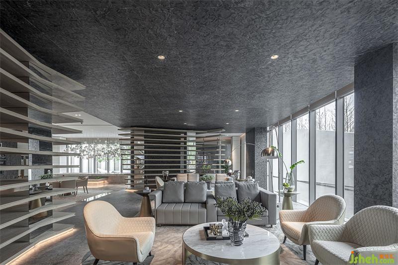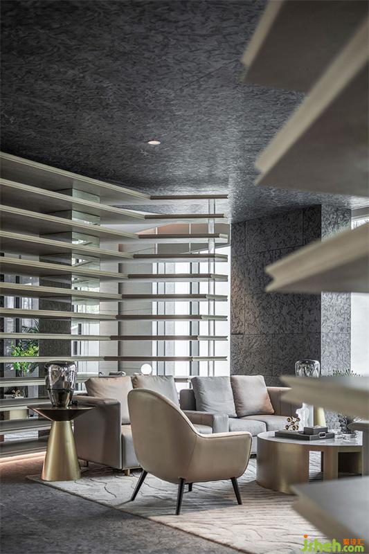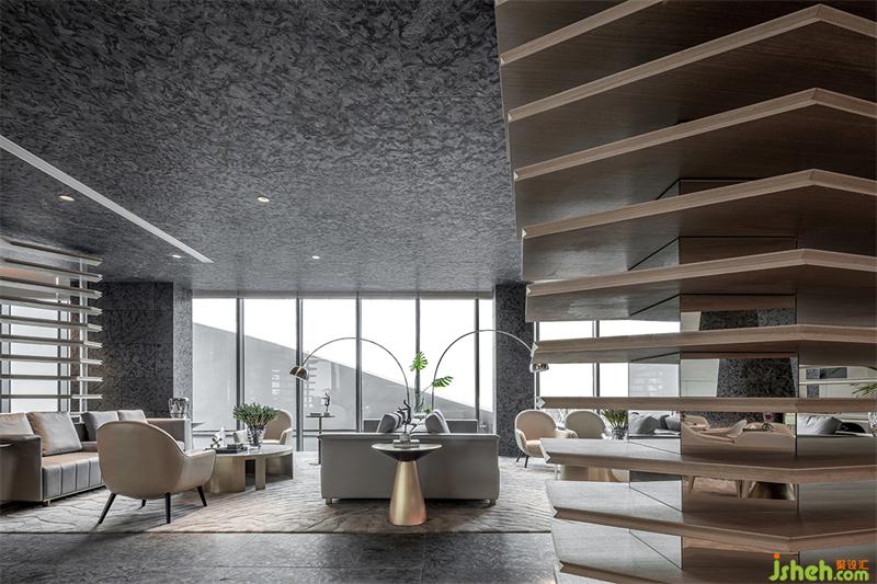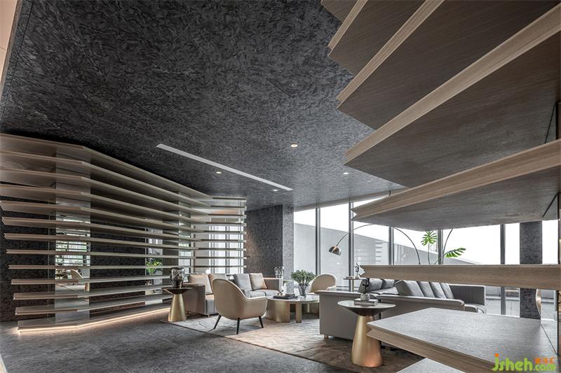 洽談區(qū)域強(qiáng)烈的幾何造型將空間一分為二,落地的全景視窗、木質(zhì)的格柵,層層遞進(jìn)的空間結(jié)構(gòu),是“豁然開(kāi)朗”最直觀的感官鋪陳,空間的力量隨著區(qū)域的分割愈加強(qiáng)烈,墻體的架構(gòu)和燈光線條在占領(lǐng)視覺(jué)的同時(shí)也完成了區(qū)域的分割,靜謐、豐盈,明亮,讓洽談更像一場(chǎng)休憩和心靈的慰藉。