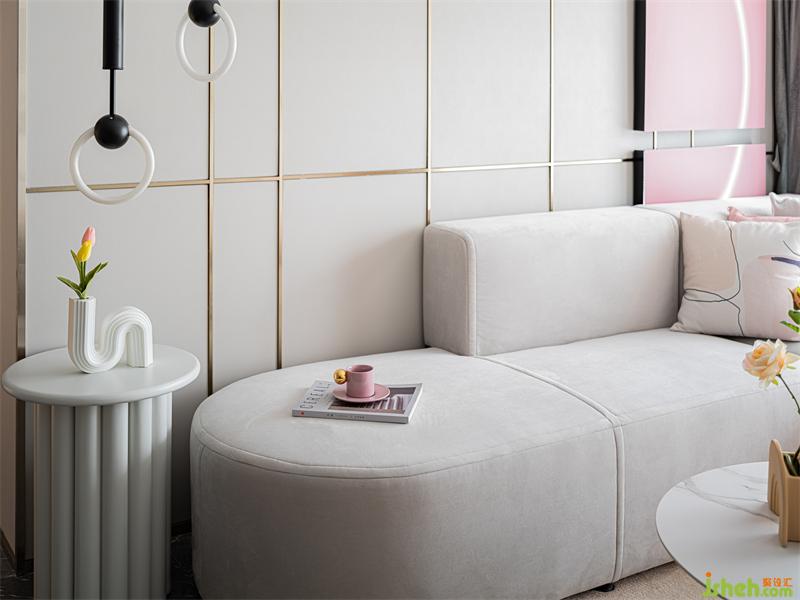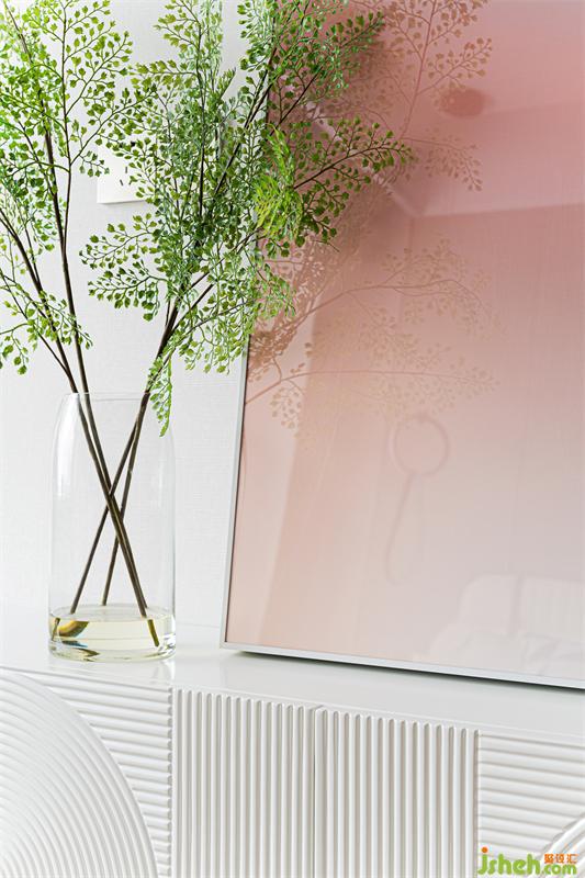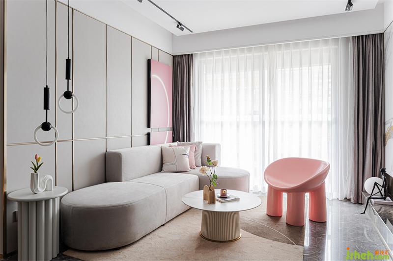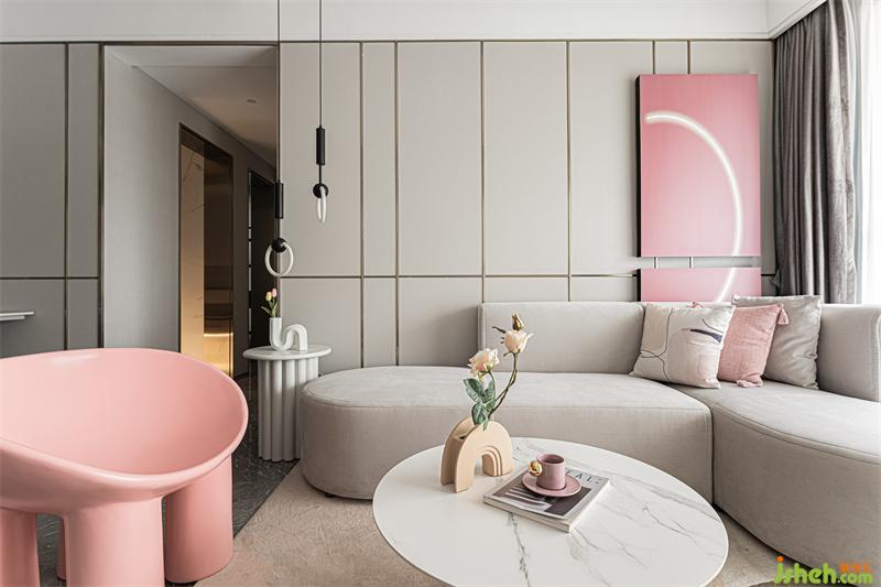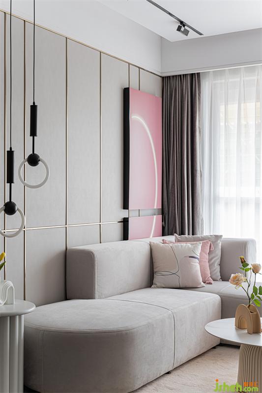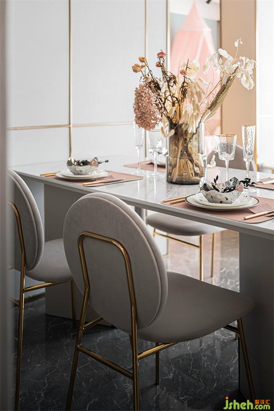 粉色給人的既定印象是少女心,空間以粉色為主,形塑現(xiàn)代文藝感。客餐廳用粉色暖色系為配色,為空間注入一絲甜甜的亮點,餐廳精致的粉色餐具與擺件搭配,和客廳的粉色扶手椅相呼應,空間略顯清新優(yōu)雅。