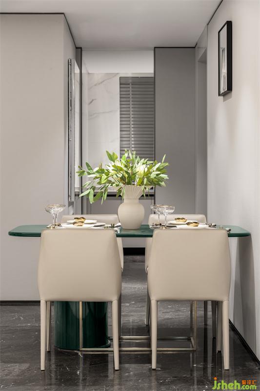 我們利用空間本身的格局,對餐廳進行了簡約化設(shè)計。米色馬鞍皮餐椅與綠色的餐桌搭配,輕巧靈動,從灰色背景中跳躍出來,塑造出清爽素雅又靜謐浪漫的格調(diào),再搭配綠色花藝,使得原本有限的空間充滿自然氣息。