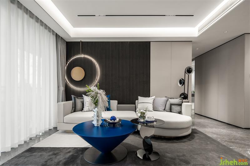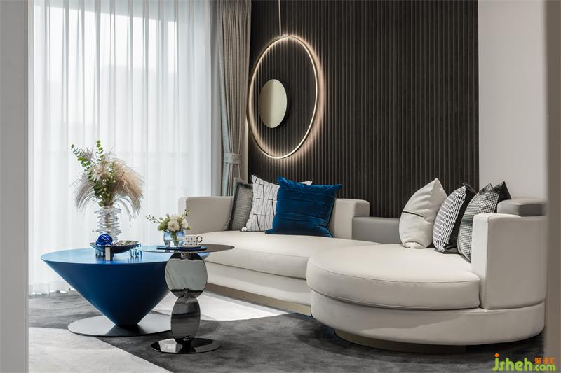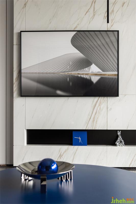 寧靜之藍,生活之味,個性的藍將客餐廳一體貫通,空間瞬間流動起來,映襯著藍色的個性茶幾,黑色簡潔的沙發(fā)背景墻也與幾何裝飾的墻飾冷暖互補,強調(diào)了空間的秩序感和節(jié)奏感。