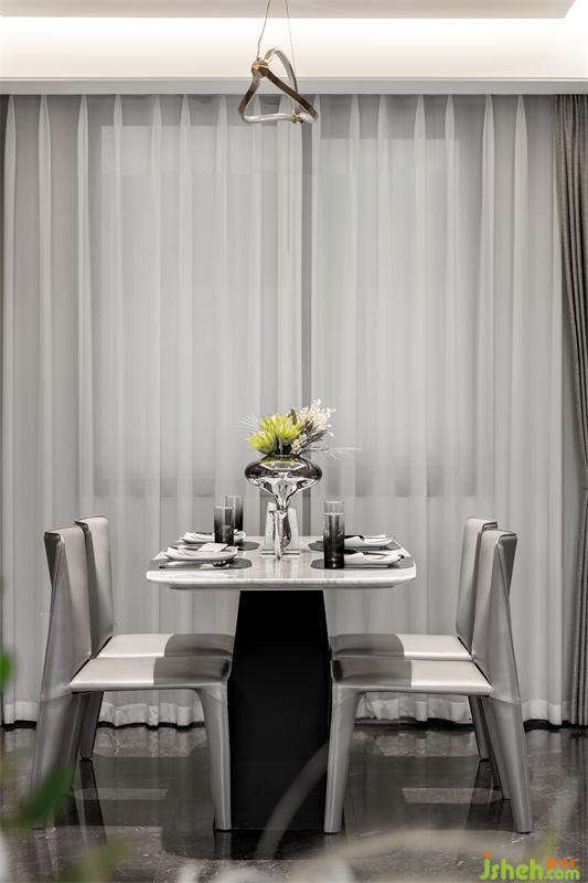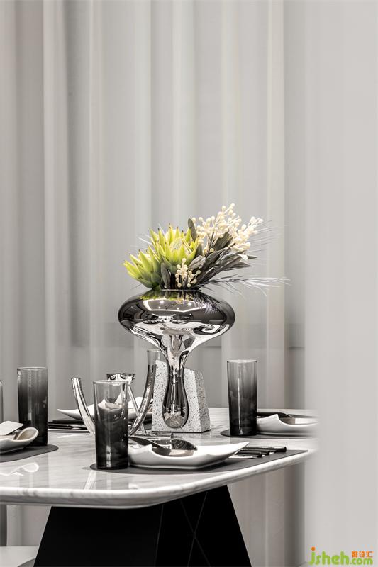餐桌與餐椅的設(shè)計都極為簡約,把舞臺留給家的煙火氣。銀色花器與餐具精致搭配,精致藏于細節(jié)。