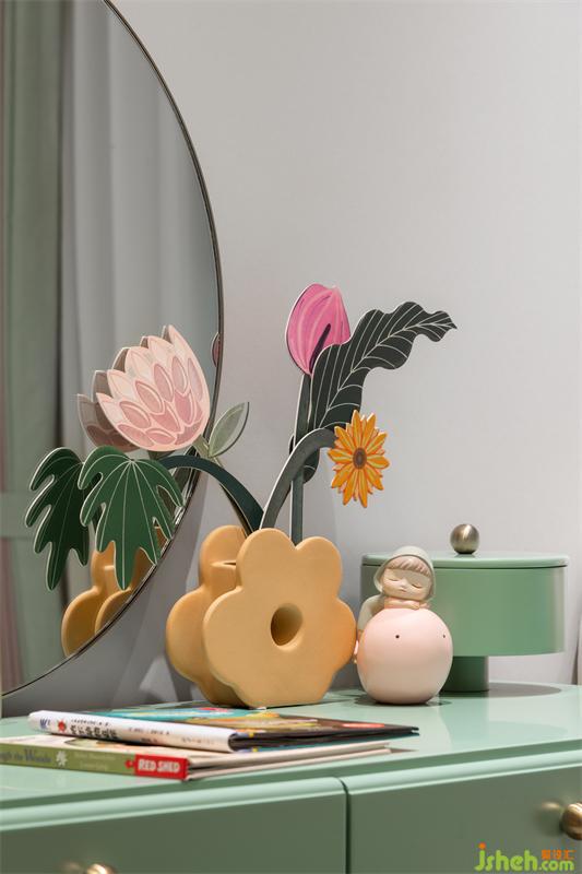 女兒房的整體色調(diào)以低飽和度的搭配呈現(xiàn),保持精致感的同時(shí)又不失活潑圓潤,一改傳統(tǒng)設(shè)計(jì)中過量的粉飾,清淡純真的色調(diào),像少女綻放的內(nèi)心世界,讓人留戀著迷。